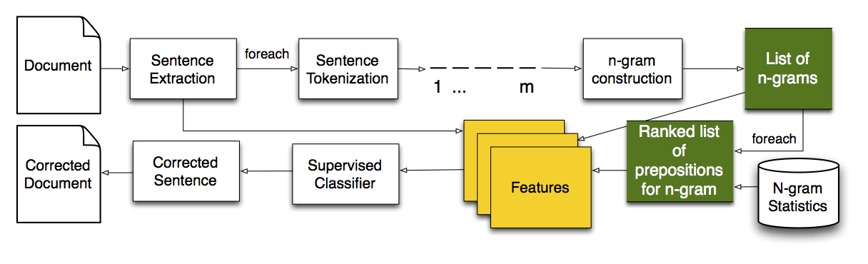 In this paper, we have developed a method to correct prepositional errors made by non-native English speakers by leveraging large-scale n-gram statistics, n-gram association measures, and machine learning techniques. The general system pipeline is shown on a picture below.